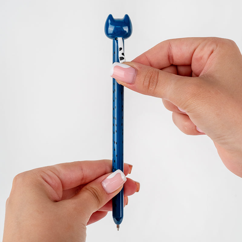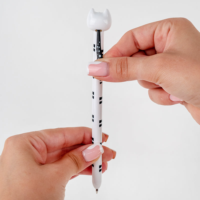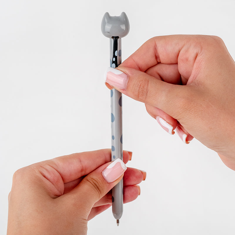 Корпус ручки виготовлено з первинного пластику — він міцний, легкий і приємний на дотик. А головна фішка — об’ємний котик на корпусі, який не просто милує око, а ще й бере участь у механізмі. Потягнув за хвостик — і вже можна писати.